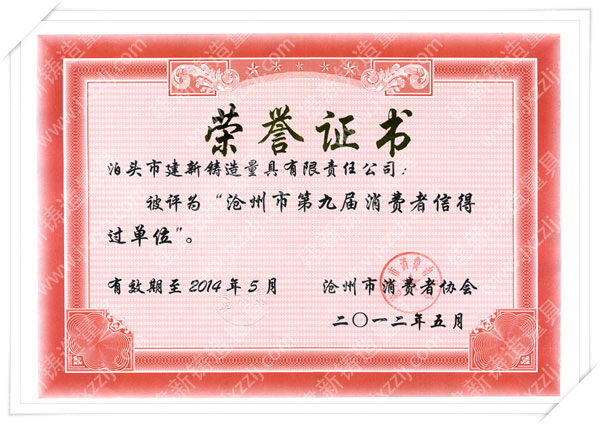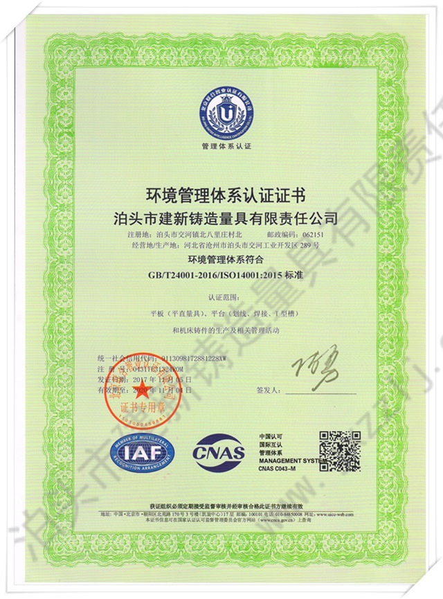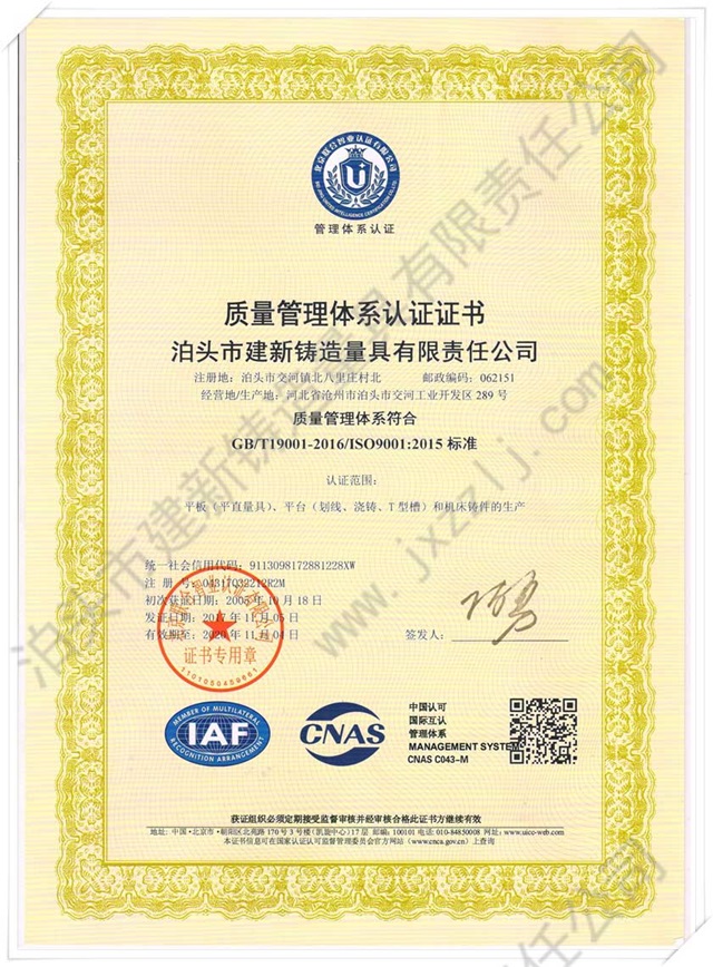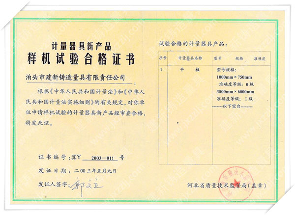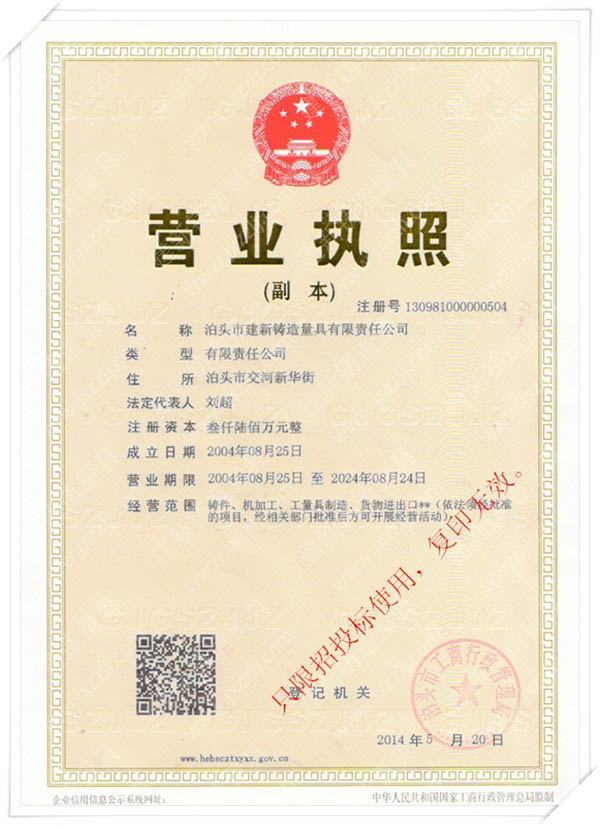 泊頭市建新鑄造量具有限責(zé)任公司是河北省固定資產(chǎn)重點投資項目技術(shù)企業(yè)。取得“建新量具-商標(biāo)注冊證”“河北省名牌產(chǎn)品”、“河北省著名商標(biāo)”、中國鑄造協(xié)會常任理事單位“機(jī)械工業(yè)質(zhì)量管理獎”、“滄州市第九屆消費(fèi)者信得過單位”、“中國人民銀行機(jī)構(gòu)信用代碼證”“、計量器具新產(chǎn)品樣機(jī)試驗合格證書“全國安全生產(chǎn)三級認(rèn)證企業(yè)”等榮譽(yù)稱號。